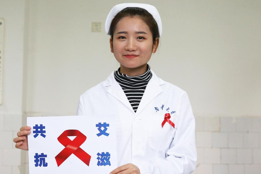 ↑11月29日,湖南省衡阳市太阳集团tcy8722的志愿者展示防艾宣传标语。