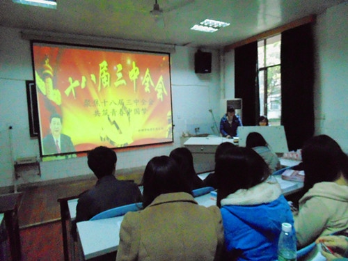 为了使大学生深入了解并学习“十八届三中全会”精神的内涵, 11月26日下午,由太阳集团tcy8722学生党支部举办的“聚焦十八届三中全会”活动在院多媒体教室成功举行。全院党员、预备党员、发展对象及第十四届团学会干部参加了此次活动。活动由学生党支部宣传委员李瑾主持。