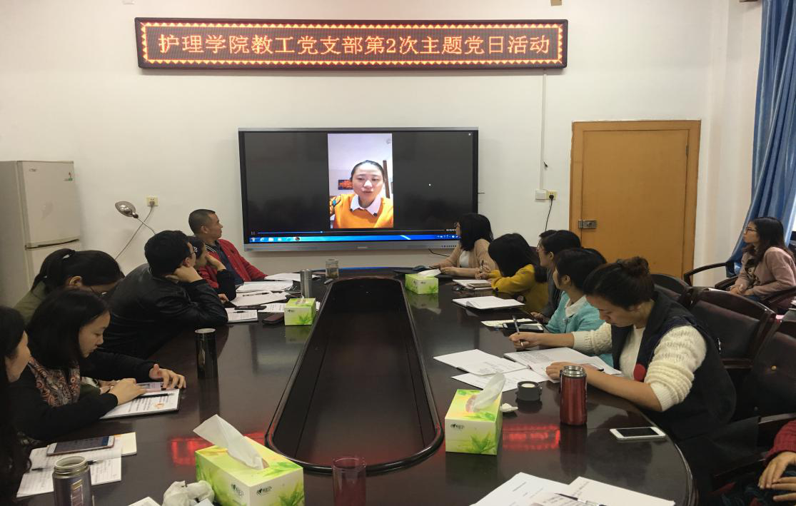 会议氛围浓厚,与会同志纷纷发言,表示要认真学习领会十九大报告精神,向榜样黄大年看齐,努力工作,为中华民族复兴伟业作出自己的贡献。即便是身在英国学习的基础护理与实训中心党支部书记王蓉老师,也通过远程视频就本次党日活动做了精彩的发言,她表示即使远在他乡,也时刻心系祖国,仍然对十九大报告全文进行了认真的学习。她强调,全体教职工人员应积极响应中共中央规划的关于建设富强民主文明和谐美丽的现代化强国的号召,深刻领会和把握报告精神,结合学校开展的一基三实,一路三建的发展思路和学院精神,做好本科生教学评估、护理专业认证和学术型硕士学位点申报三大战役。