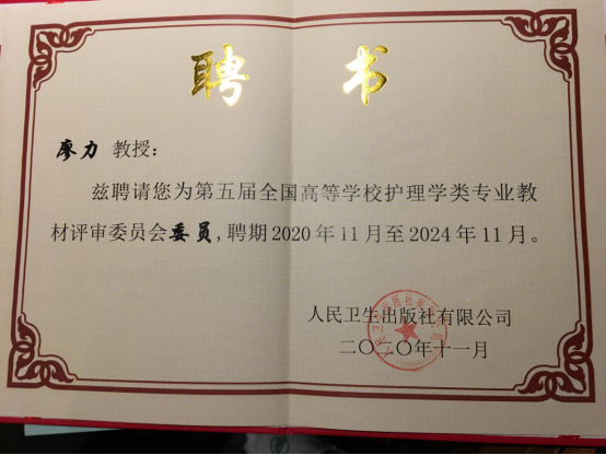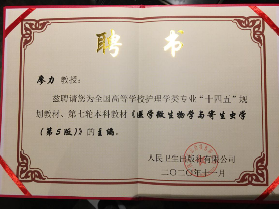 本次会议,主办方进行了护理教材评审委员会换届、新一轮护理系列教材主编换届。廖力教授被聘为第五届全国高等学校护理学类专业教材评审委员会委员、全国高等学校护理学类专业“十四五”规划教材、第七轮本科教材《医学微生物学与寄生虫学(第5版)》主编。
