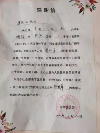 在下车之前,熊明犀收到了铁路运营部门的感谢信。对此,他表示:“救死扶伤是医护人员的本职,遇到类似的突发情况,相信每名医护人员都会奋不顾身、勇往直前。这次经历,是我实习以来第一次独立面对的一个紧急情况,虽然所做的微不足道,但这也更加让我体会到护理专业的价值和意义所在。四年的专业学习有朝一日能够派上用场,能够为他人的生命注入能量和色彩,这或许就是作为一名护理人的骄傲吧。”