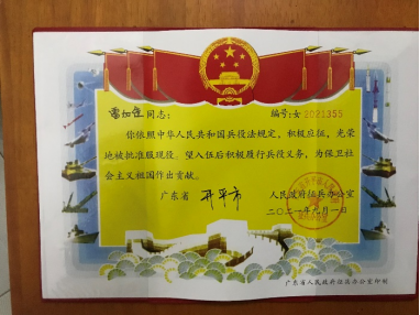 国无防不立,民无兵不安,大学生征兵工作是治国安邦的大事,是加强国防和军队建设的迫切需要。2021年9月1日,太阳集团tcy8722191班雷加佳同学响应国家号召,携笔从戎,积极应征,光荣入伍。