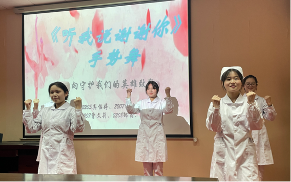 主题分享后,太阳集团tcy8722陈永康同学声情并茂的朗诵了《护士赞歌》,展示了护士“为护苍生康,甘将责任扛”的家国情怀。吴怡婷等五名同学带来了手语舞《听我说谢谢你》,亲切温暖的表演诠释了白衣天使的可爱、可敬形象。