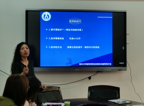 单云丽老师从学生给自己的一封信开启了这次分享,单老师结合自身的辅导员工作经验,分享了与学生相处的方法和批评的技巧,并结合具体事例和做法,给了辅导员很多建议,分享中她强调辅导员工作一定要有耐心,态度温和、宽严相济,在处理学生事务中,要不要批评,什么时候什么场合批评,都要讲究方式方法。