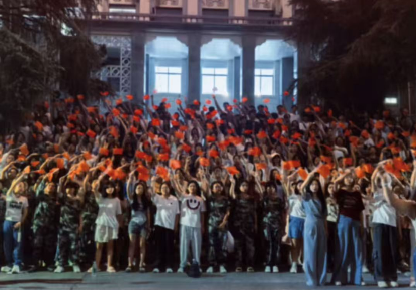 夜幕降临,随着熟悉的旋律响起,《我和我的祖国》大合唱正式拉开帷幕。没有专业的伴奏,没有华丽的舞台,但新生们的歌声却格外动人;手中挥舞的五星红旗,在灯光下格外鲜艳,与嘹亮的歌声交织在一起,构成一幅充满青春朝气与爱国情怀的动人图景。