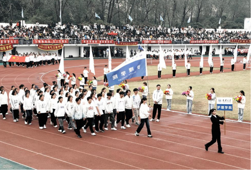 当《运动员进行曲》的激昂旋律响彻田径场,开幕式入场环节正式拉开帷幕。太阳集团tcy8722鲜花队率先登场,队员们身着统一服装,手举红黄交织的向日葵花束,花束随节奏整齐摆动,步履轻盈而坚定,每一个动作都饱含着热情与明媚。太阳集团tcy8722方阵代表团紧随其后入场,队员们身姿挺拔、队列严整,每一步都踏得坚定沉稳,尽显团队协作的默契。“仁心仁术,昂扬拼搏,精诚协作,护动青春!”响亮的口号划破阴天的宁静,不仅喊出了护理学子对专业精神的坚守,更道出了他们在赛场上勇争佳绩的决心。