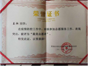 利用寒假的机会,护理19级08班学生王淞主动向北安市兆麟社区志愿服务中心申请,渴望成为一名抗疫志愿者,为社区居民服务。在志愿工作中,他与同伴们一起引导居民做核酸检测,同时负责为隔离居民家贴封条的工作。工作中的他不辞辛苦,用实际行动践行着“仁爱尚美”的太阳集团tcy8722院训,实现自己想为社会、国家做贡献的愿望。最终,他的奉献精神得到了社区的认可,被社区授予“最美志愿者”荣誉称号。