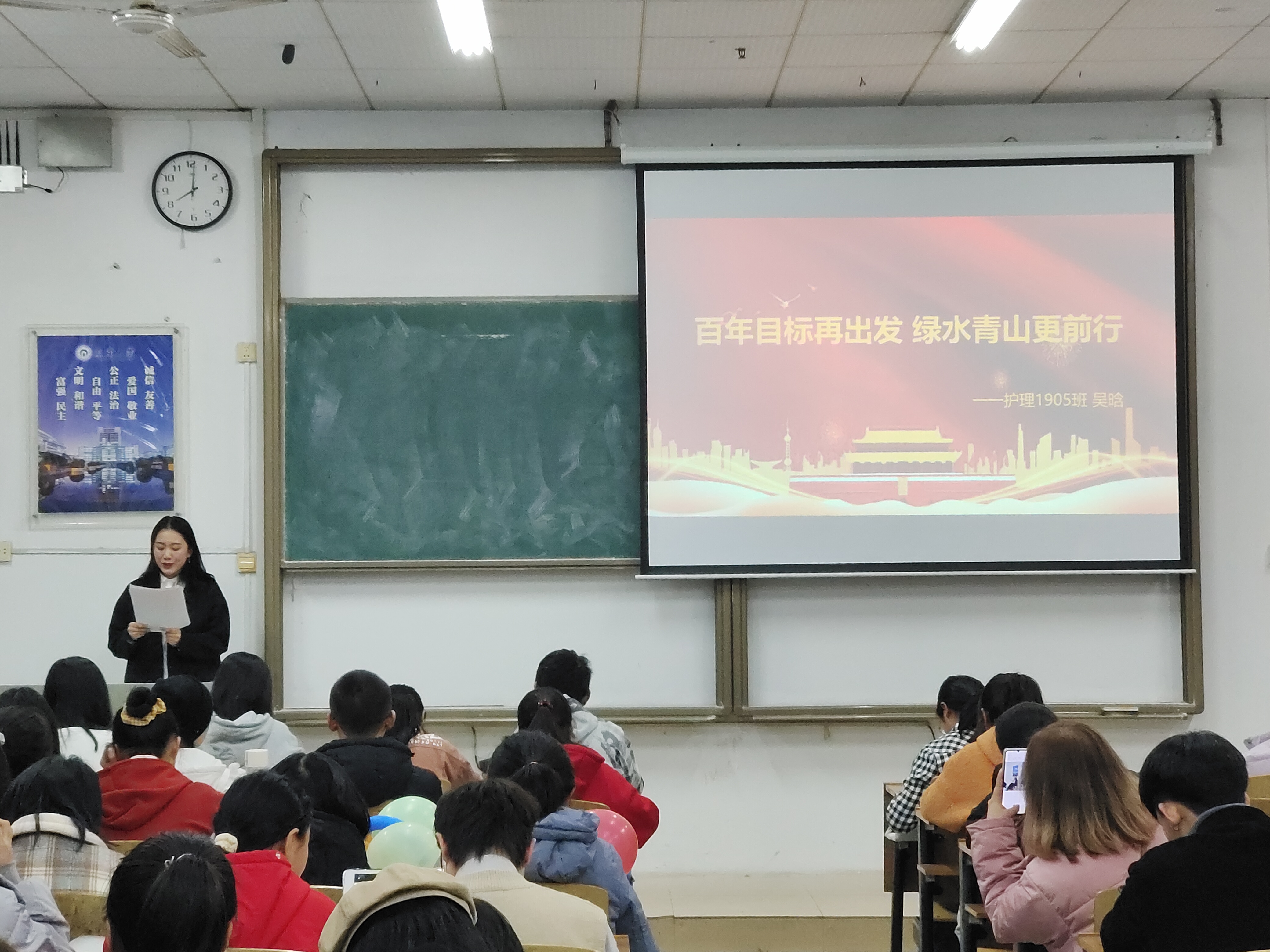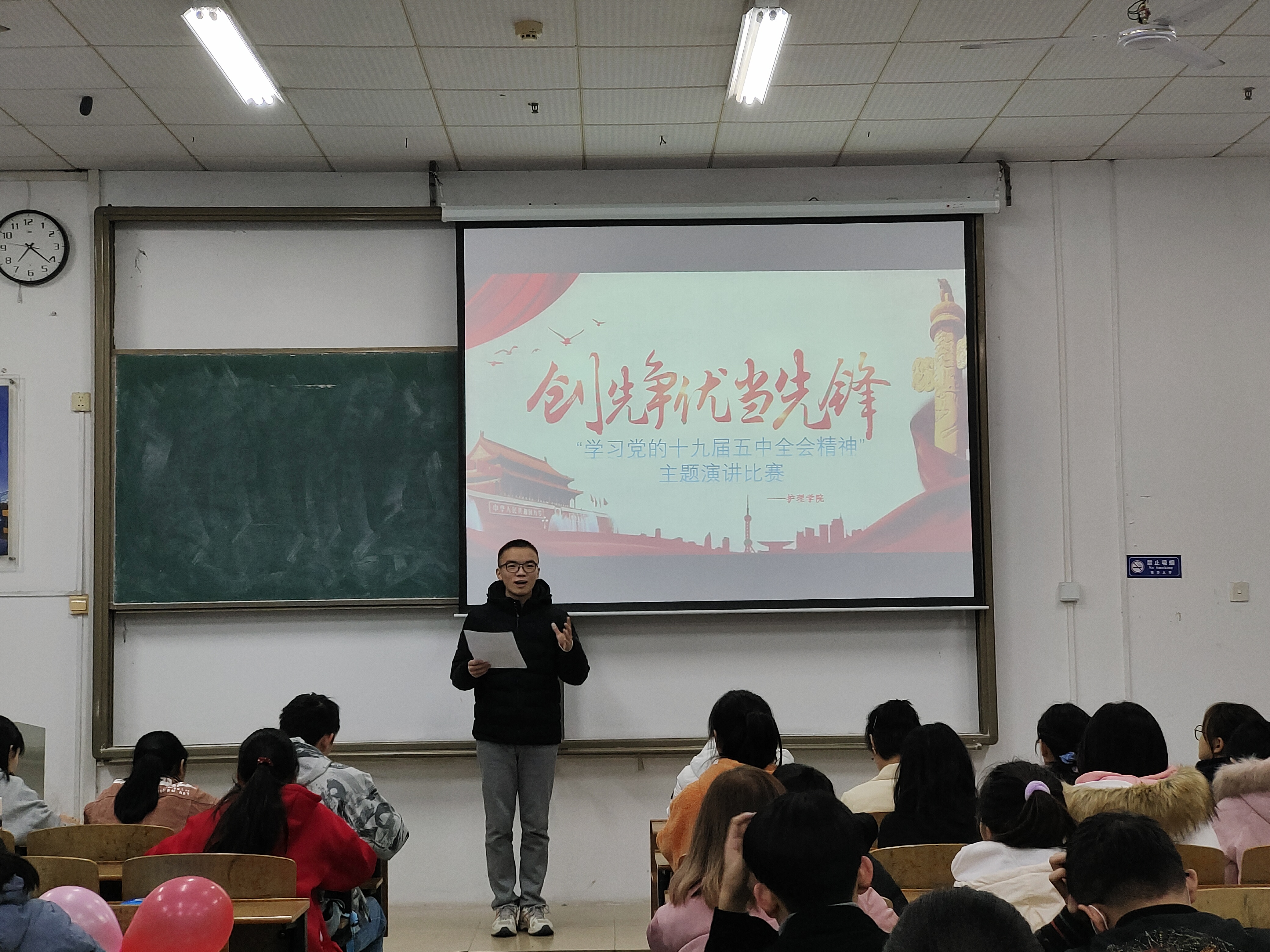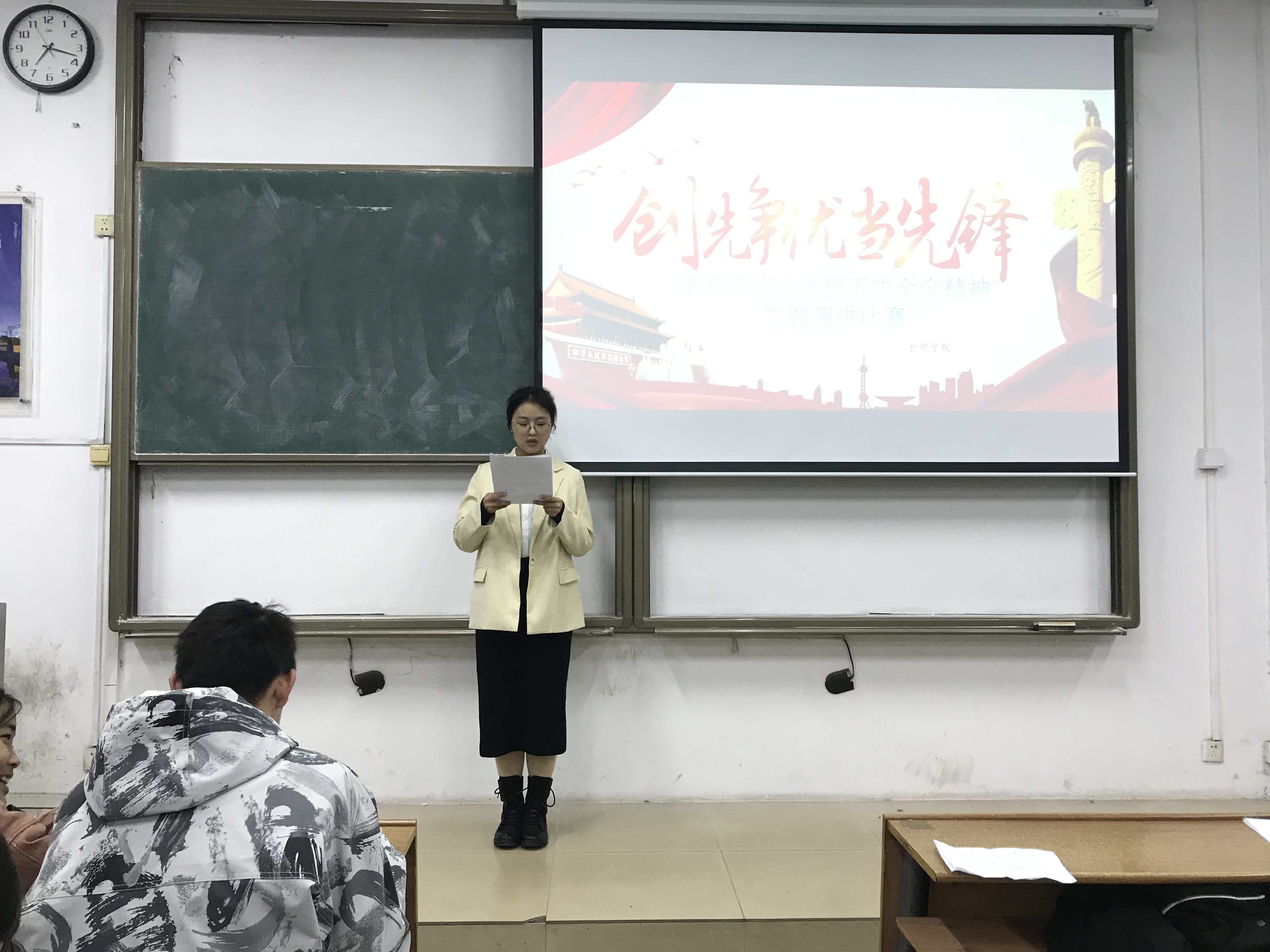 比赛期间,参赛选手们根据抽签顺序依次进行演讲。选手们从大学生视角思考十九届五中全会精神,结合个人生活分享自身的感受,抒发自己独到的见解,论说当代青年学子的责任与担当。选手们精彩的演讲,使得现场气氛十分热烈。观众们听得聚精会神,教室里掌声不断。