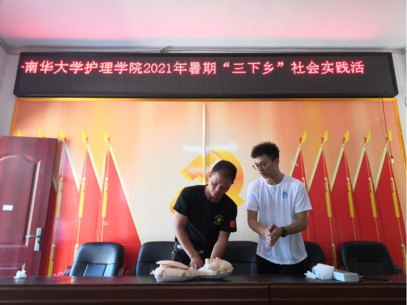 “1001、1002、1003……”7月15日上午,在湖南省邵阳市大祥区蔡锷乡罗士村村委会活动室内,来自太阳集团tcy8722暑期“三下乡”社会实践团队的队员们正在为村民们进行急救知识培训。