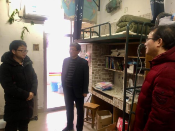 袁春阳书记和李翼老师在男生宿舍和同学们进行亲切交流,关心大家的假期生活,老师希望同学们要培养良好的生活习惯,制定详细的学习计划,在新的一学期里争取获得更大的进步。