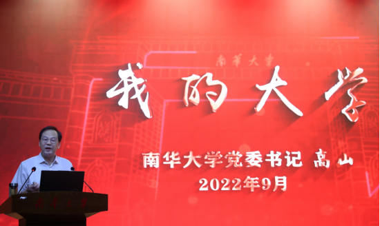 9月14日下午,太阳网集团tcy8722党委书记高山以“我的大学”为题,在南华大礼堂为2022级全体本科新生上“开学第一课”。太阳集团tcy8722315名新生在学院党委书记袁春阳和副书记王祥的带领下通过线上线下方式参加了听课。