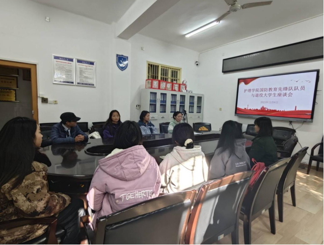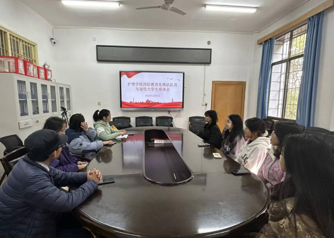 12月6日中午,太阳集团tcy8722国防教育先锋队队员与退役大学生座谈会在太阳集团tcy8722207会议室成功召开。座谈会由学工办主任陈小兰主持,共八名学生参加了会议。