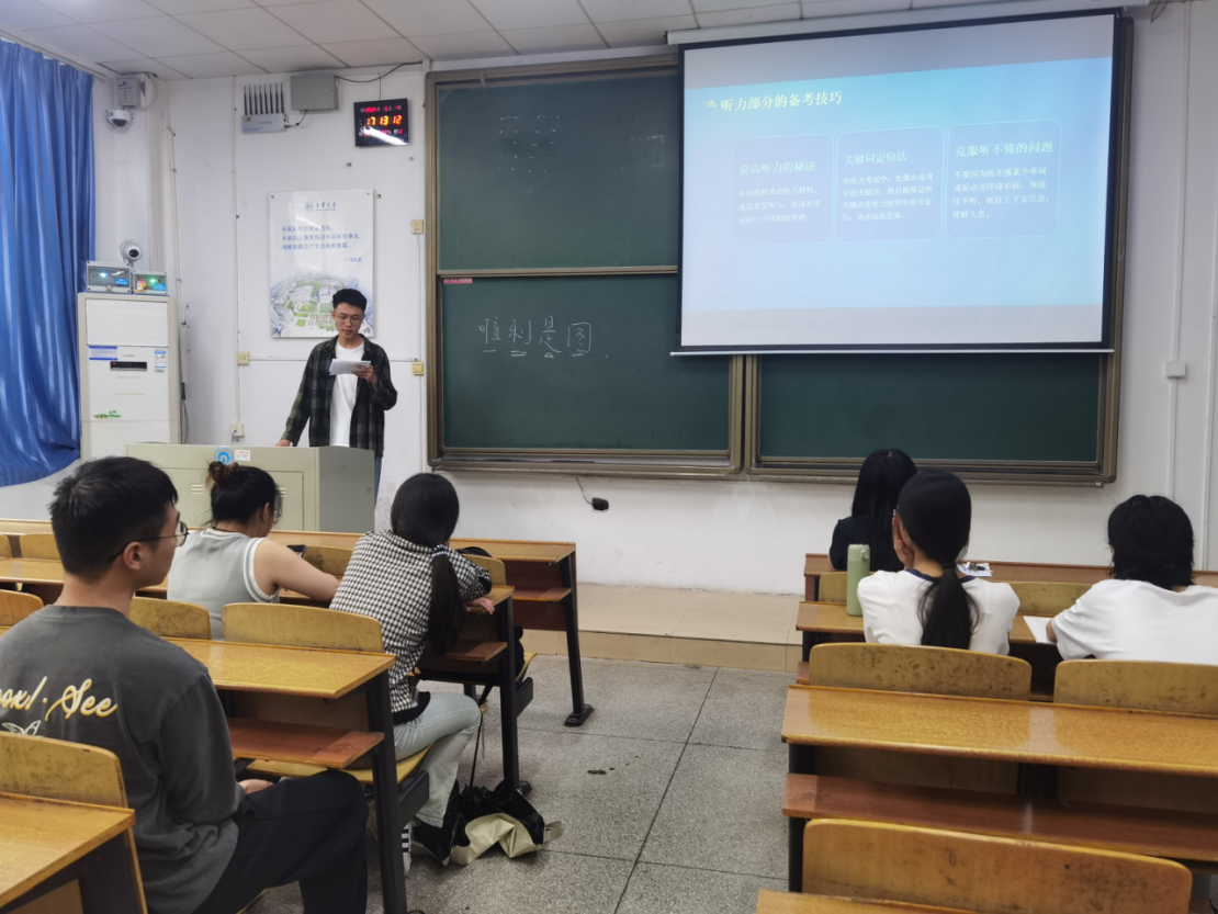 大学英语四六级是大学学习的重要内容,能够提高学生的英语学习素养,同时对未来就业也有一定的帮助。本次四六级学习经验分享会,宣讲同学结合自身学习经验,以英语四六级考试题型为切入点,向在场同学们分享了自己的学习方法,充分发挥了我院优秀同学的示范引领作用,激励着学生们奋发有为,同时,也培养了“小老师”们乐于助人、甘于奉献的良好品质。