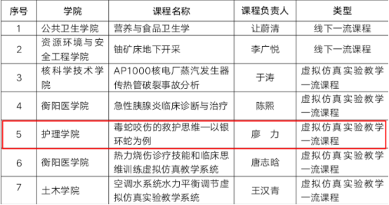 此前,我院廖力教授负责的《毒蛇咬伤的救护思维—以银环蛇为例》获得国家级一流本科课程,吴艳平教授负责的《社区护理学》、王蓉副教授负责的《护理学基础(双语)》获得省级一流本科课程。目前为止,我院共有国家级金课1门、省级金课5门。