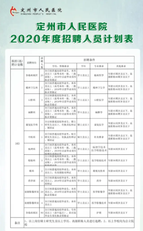 (一)招聘人数2020年定州市人民医院面向社会公开招聘163名卫生专业技术人员