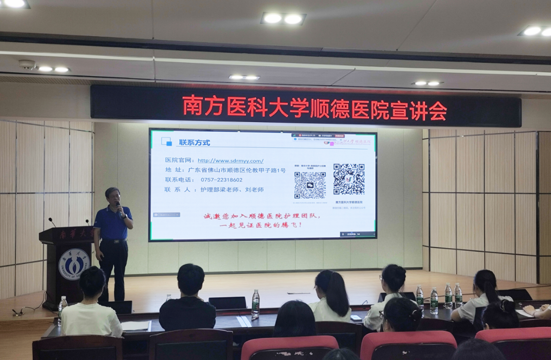 南方医科大学顺德医院由院护理部主任吕春梅带队,一行4人来校,主要围绕护士招聘、硕士研究生导师、实习生临床实践等内容进行交流讨论。吕春梅就医院地理位置、生活宜居程度、薪资待遇以及医院的综合实力等方面进行了详细的讲述,特别强调了医院重视岗前培训、鼓励学历提升等人才引培战略。顺德医院烧伤科护士长、太阳网集团tcy8722优秀校友肖志平向同学们介绍了顺德这座城市,并分享了顺德医院的福利待遇、城市房价、发展平台、科研经费等支持措施,希望更多学弟学妹能够加入顺德医护大家庭。