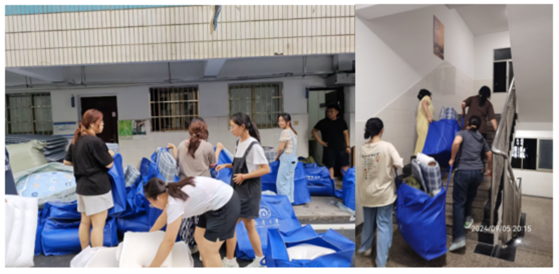 同时,院团学干部有序分工,分装新生床上用品和生活用品,组织志愿者将床上用品和生活用品配送至相应新生的宿舍床位,并逐一张贴床位表和宿舍内务贴士,保障新生安心、舒服入住。经过全院师生的共同努力,顺利完成了新生宿舍准备工作。
