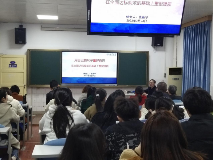 张新华老师宣讲的题目是《用自己的尺子量好自己-在全面达标非凡的基础上塑型提质》。报告从“认识新一轮本科教育教学审核评估”“学校教育教学审核评估安排”“学校对学术型人才培养的基本理解”“学院层面的评估工作四类任务要求”等四个方面详细介绍了“新一轮审核评估”的基本要求及内容,着重阐述了新一轮审核评估的指导思想、原则,论述了学校以学术型人才培养为办学目标的定位和培养过程中涉及的关键问题;介绍了学院层面评估工作四类任务指引,指出学院应在理顺、理清四类任务的基础上,扎实落实任务清单,以标准作为尺子、以常模作为镜子,进一步全面规范教育教学制度和要求,在全面达标规范的基础上达到“塑型提质”,结合太阳集团tcy8722的具体情况,就如何做好审核评估的准备工作提出了很好地意见和建议。