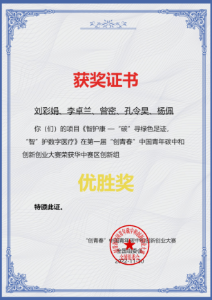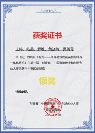 此次大赛,我院学子在华中赛区创新组中获得两个奖项。其中,由我院曾谷清教授、湖南省提灯医疗科技有限公司董事长谭宗威指导,2021级研究生王婷同学为主创的参赛项目《智约一一低耗高效的疫苗预约储存一体化系统》喜获华中赛区创新组银奖;2021级研究生刘彩娟同学作为主创的参赛项目《智护康一“碳”寻绿色足迹智”护数字医疗》获得华中赛区创新组优胜奖。