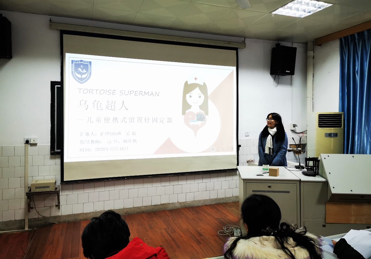 在王淑敏老师的主持下,二十支参赛队伍的负责人按照抽签顺序依次上台讲解参赛项目。每支队伍的项目各具特色,从护理发明创作到医学云端平台、研究方法均有创新,从高“压”无忧护理箱到临床工作中血运观察仪的创新设计,充分展现了我院学生关心科技前沿、留心生活小事、钻研专业知识的良好品质,以及脚踏实地、认真细致的学习态度。各位评委老师根据选手展示的项目内容提出问题和建议,选手进行现场答辩。