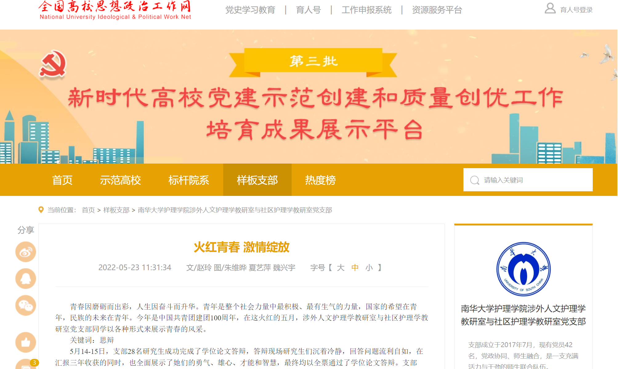 上一条:火红青春 激情绽放 --人文与社区护理学教研室师生联合支部学生五月活动综述 下一条:【样板支部】 落实警示教育 加固廉洁防线