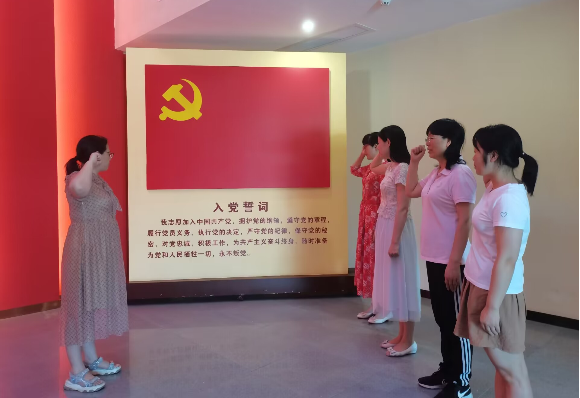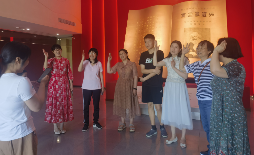 在宣誓厅时,李健芝带领全体党员,面向鲜红的党旗,举起右拳,重温了入党誓词。铿锵有力的誓言表达了对党的无限忠诚和热爱以及为共产主义事业奋斗终生的坚定决心!