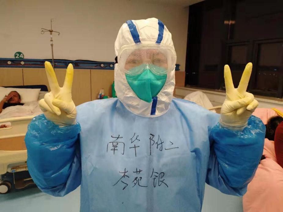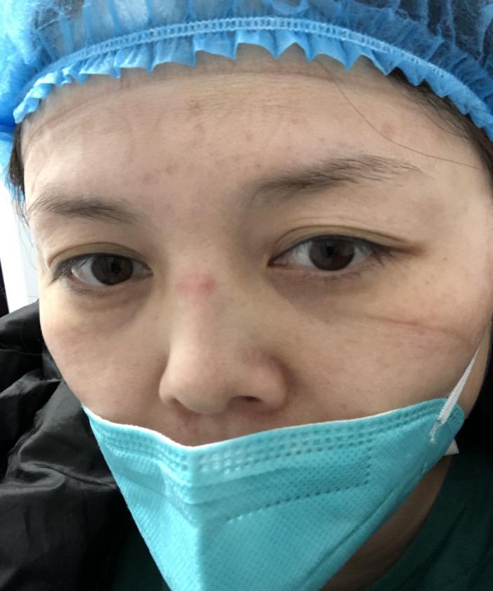 在酒店进行了为期3天的学习和培训后,医疗队伍前往大别山区域医疗中心进行医疗支援。在这里,李苑银和她的同事每天连续工作10余个小时,始终穿梭忙碌在各个病房间;为节约防护物资,期间不喝水、不进食、不去卫生间。在工作期间,常常因温差原因导致护目镜起雾看不清物体,打针基本靠经验与感觉,但是这难不倒作为“老把式”的李苑银,即使戴着4层防护手套,也保证了“一针见血”——留置针100%的命中率。奋战在湖北黄冈的她与同事们,即使在工作的过程中疲惫不堪,即使脸颊和鼻梁因口罩和护目镜的长时间佩戴而有了深深的压痕,也义无反顾、无怨无悔。