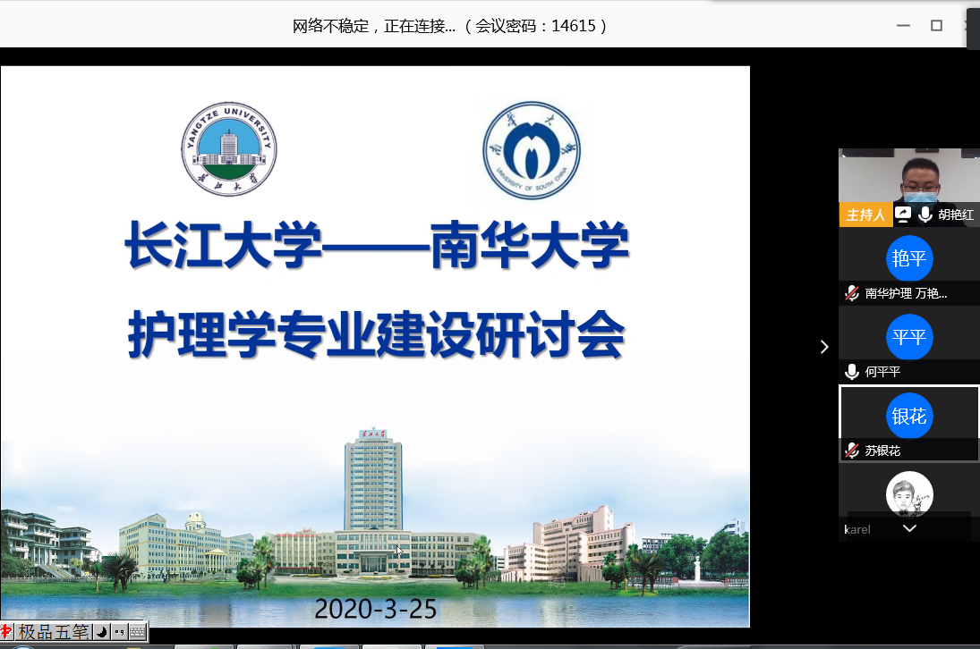 疫情时期,地处湖北省荆州市的长江大学悉知我院护理学专业成功获批国家级一流本科专业建设点,并以优秀成绩通过了教育部护理学专业认证,希望学习我校经验,因疫情不能实地考察,故于2020年3月25日上午9点召开护理学专业建设视频研讨会,两校就护理学专业国家级一流本科专业建设点申报与建设、本科专业认证评估等方面进行深度交流。长江大学医学部常务副部长龚权、副部长黄江荣、健康医学院副院长陈晓光、护理系主任周红、护理系副主任龚爱萍、胡艳红,太阳集团tcy8722院长廖力、副院长何平平、曾谷清、党委副书记彭建南,以及两校各教研室主任和全体教师参与了此次视频研讨会。会议由长江大学陈晓光副院长与太阳集团tcy8722何平平副院长共同主持。
