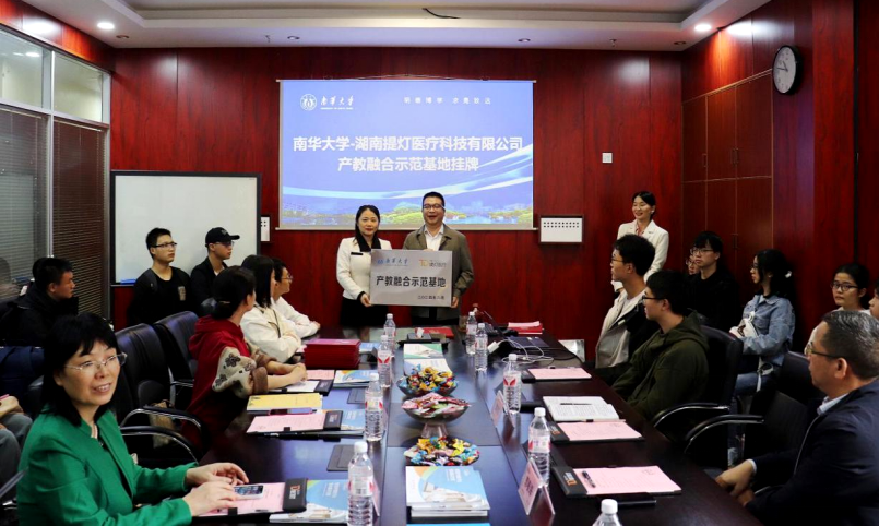 王蓉副院长与谭宗威董事长共同为产教融合示范基地挂牌。王蓉表示,产教融合示范基地的挂牌标志着我院与湖南提灯医疗科技有限公司的合作进入了新的阶段,希望该公司一如既往的支持我院本科生教育。随后,双方就创新班本科生学的创新能力培养、综合素质提高等进行深度交流探讨。