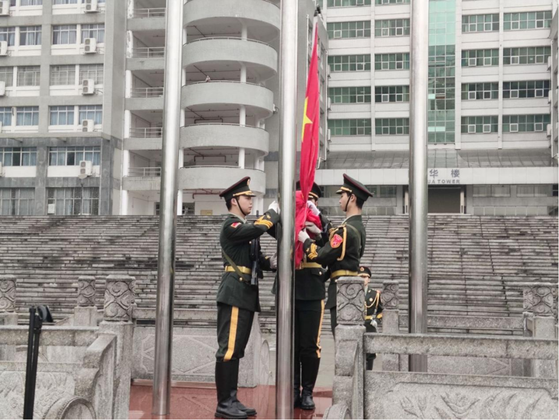 气宇轩昂的国旗护卫队迈着坚定的步伐护送五星红旗走向升旗台,在庄严的国歌声中,鲜艳的五星红旗迎风飘扬,全体师生庄严肃立,心中饱含对党和国家的崇高敬意,向国旗行注目礼。