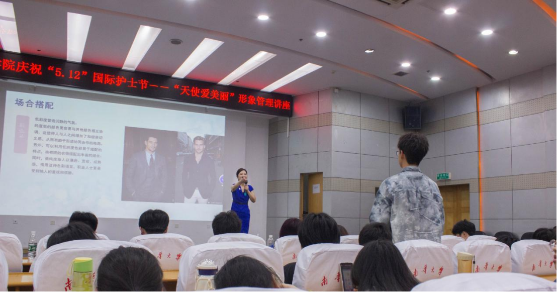 在讲座中,徐湘萍老师通过情景导入、互动交流、参与展示等多种方式,生动形象地讲解了有效护肤、化妆加持,色彩运用和服装搭配四个方面,为在场的护理学子们带来了一场精彩的视听盛宴。